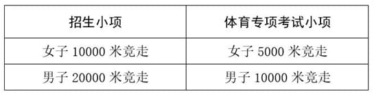 (三)女子10000米竞走、男子20000米竞走招生小项与考试小项对应关系如下表,其余报考小项与体育专项考试小项一致。